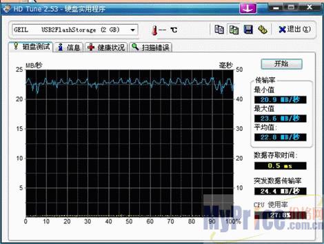 接下面我们来看性能,极速双通道U盘是真正基于USB2.0架构的产品,能够真实展USB2.0接口优势的产品,读写速度理论可达30MB/s(近似值)。存储芯片方面采用了超高速的SLC构架A级Flash芯片。下面用HD TUNE这款磁盘测试工具测得数据截图显示传输率达到24M/S左右的极速,的确不负极速双通道的名头。