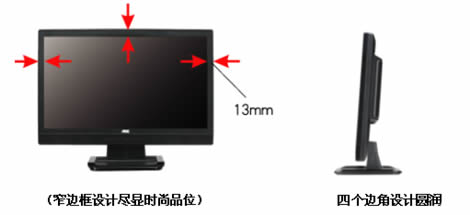 其实,和22寸宽屏相比,2116S微弱的“0.4英寸牺牲”并不会改变用户的物理视角差异,仅凭肉眼基本上区分不出来。虽然尺寸上略有“缩水”,但是在性能上,2116S却大有提升,在DCR丽比技术,高达3000:1的动态对比度以及16.7M色面板的完美配合下,用户能更好的享受2116S所带来完美的色彩视觉及高清晰度体验。 从外观上看,2116S秉承了AOC一贯时尚简约的设计风格,全黑色的机身,给人的感觉稳重、大方又不失专业的水准。13mm的窄边框设计给人的感觉整个屏幕要比210V看上去似乎要大一些,从而也突出了大气的一面。四个边角设计比较圆润,不是那么死板,整体线条设计流畅、简明。