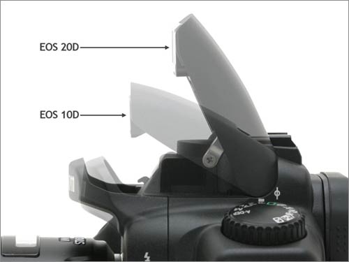 从照片可以看出20D机顶闪灯高度比10D要高出许多,这样做的好处是可以大大减少机顶闪灯被镜头遮光的机会。20D机顶闪灯大概有13指数,支持E-TTL II,意味在闪灯测光时着镜头的长度信息也会计算在内,测光更精确。