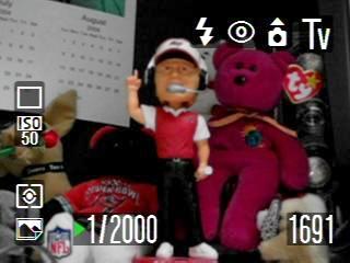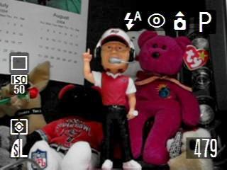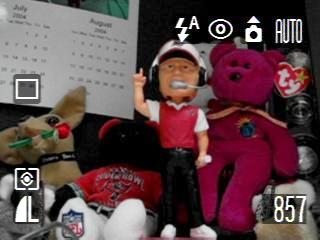 自动拍摄模式下的菜单,可以看到闪光灯自动,消除红眼,单张拍摄,图片尺寸为大,剩下的CF卡还可以拍摄857张照片,大家看看他用什么卡就知道为什么能拍摄这么多张了。