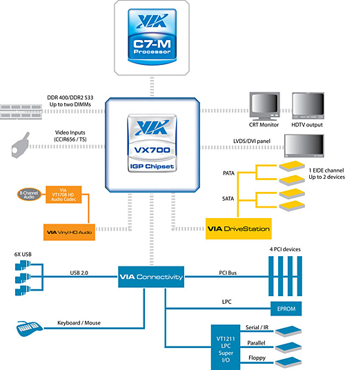 相比CX700的芯片,VX700要小很多,而且他也将支持DDR2-333/400/533的内存,针对UniChrome Pro、MPEG-2/4、WMV9等应用有了进一步的提升。机器支持两个ATAII接口,一个Ultra ATA×1接口。拥有6个USB2.0,4个PCI。
