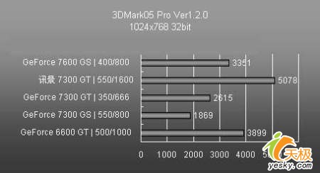 比如标准版的7300GT虽然采用了很低的核心/显存频率,但是性能依旧将高频7300GS轻松击败。这完全凭借了它的128bit显存位宽以及8条像素渲染管线,在大部分的测试当中7300GT均超越自己的同门师弟接近一倍的距离。特别是GF7300GT GDDR3版本的表现上更是让人惊讶!它甚至轻松的超越了7600GS,性能直逼7600GT,在多个项目测试中甚至将7600GS远远的甩在了身后。
