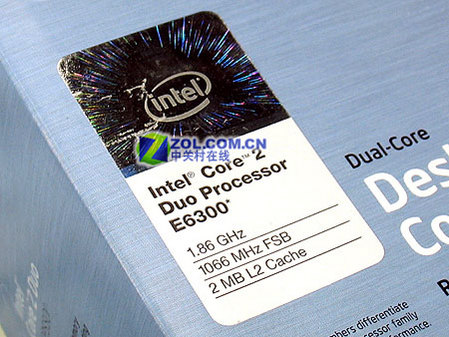 产品角标上标注了“Intel Core 2 Duo Processor E6300”,实际主频为1.86GHZ,前端总线为1066MHZ,L2级缓存容量为2MB。