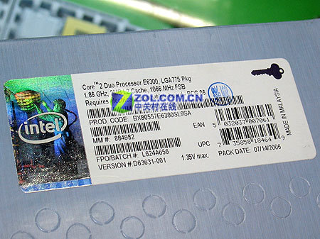 产品仍采用LGA775接口,生产编号为BX80557E6300SL9SA,批次为L624A656,版本号为D63631-001。最大工作电压为1.35V,产地为马来西亚。