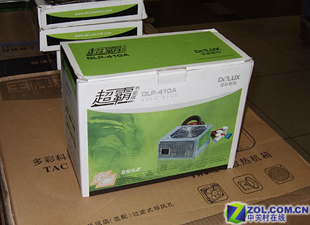 多彩DLP-410A电源采用绿色纸盒包装,包装上的怪物图案让这款电源在外观上多了几分霸气。包装盒底部明确印有“双核电源”的字样。