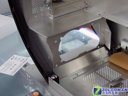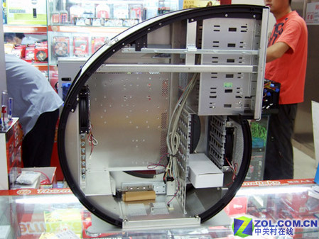 海螺内部的做工和用料同样一丝不苟,由于形状的限制,硕大的机箱内部空间并不是太宽敞。内部结构采用了全铝质构架,采用厚度在0.8mm左右的铝板,用料非常奢华。机箱具有5个光驱扩展位1个软驱位,从这个角度还能看见支撑机箱的横梁。硬盘支架采取了横向设计,具有6个扩展位,方便用户扩展和拆装。