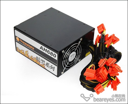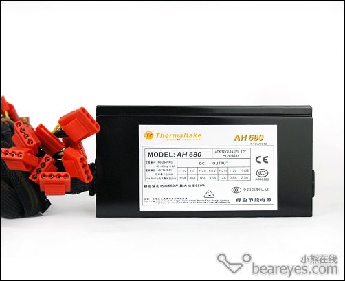 侧面的铭牌还是非常清楚的,额定550W,三路+12V:18A/16A/12A,+3.3V:30A,+5V:30A,由于Intel ATX +12V V2.2规范中只规定了最大450W输出的标准,我们根据各路比例评价,AH680符合2.2的要求。适应电压:160V-264V,作为主动PFC的产品来说,这个指标是不难实现的。小熊在线www.beareyes.com.cn