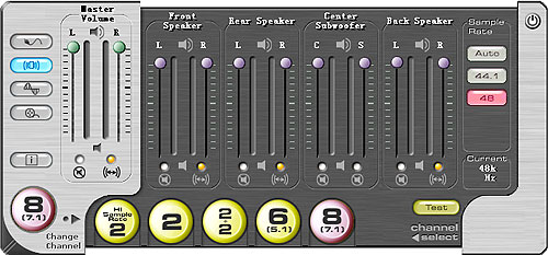 此界面可以对Windows的声音调节界面的显现、立体声加重和使用平滑图形界面进行控制。另外还有语言的调节,可以选择英文或者中文,只是选择中文以后,界面出现的不是中文而是乱码,也就是说这个选项适合那些能看得懂乱码的朋友。同时下面还有驱动版本的信息等。