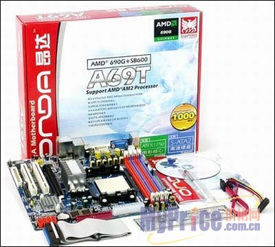 昂达A69T基于AMD 690G+SB600芯片组。SB600是目前AMD最高端南桥芯片,相比上代产品,SB600南桥芯片兼容性和功能上有了长足的进步,它提供4个SATA和10个USB接口,并支持多种RAID模式。