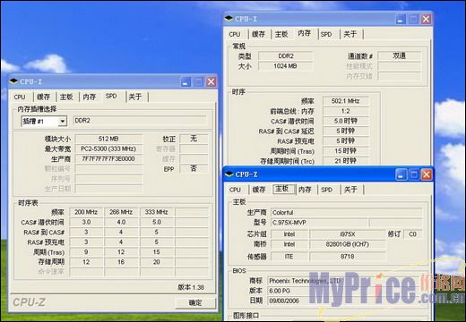 Intel公布的i975X规格最多支持DDR2 667,所以我们使用了PQI DDR2 667作为测试内存。在默认1.9V电压下,这款内存上到了DDR2 900,看来内存并非这款主板的瓶颈。然后我们把内存电压加到了2.1V,把内存上到了DDR2 1000,这款主板连未来主流的DDR2 1066规格的也能支持。