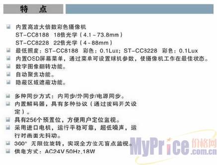 三立 ST-CC8008系列室内一体化低照度高速球型摄像机是专为室内监控系统而设计的。内置的摄像机采用无铅焊剂,底盘结构紧凑、能适用于照度较低的环境;采用宽动态技术,使摄像机在光线反差较大的场景下,捕捉到高质量的图像,让您不会错过安全监控的任何细节;镜头可在水平方向360° 无限位旋转,垂直180° 旋转,配备数字翻转技术,实现全方位无盲点监视;隐私区域遮蔽功能可防止操作员误操作及保护公众隐私权;该类摄像机可满足市场对高性能监控设备的需求。