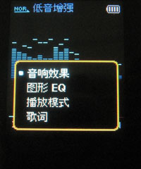 音频播放自然是一款MP3最常用的功能,三星K3支持MP3、WMA、OGG格式,在播放界面下,按菜单键则可以调出子菜单功能,提供了音效调节、图像EQ、播放模式、歌词等调节。具备五种音效:正常、声音、低音增强、3D音响效果以及音乐厅。而播放模式则有正常、重复文件夹、重复全部、重复单个、随机文件夹、随机所以等模式。