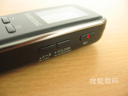 作为一款录音笔,实时、迅速的相应是必不可少的,三星YV150除了本身的反应速度以外,也需要科学的按键安排,我们无论用那只手握住这款录音笔都可以轻松的让大拇指控制机器右侧的录音键。在这一侧,除了录音键以外,还拥有标签键以及重复键,操作起来方便快捷。