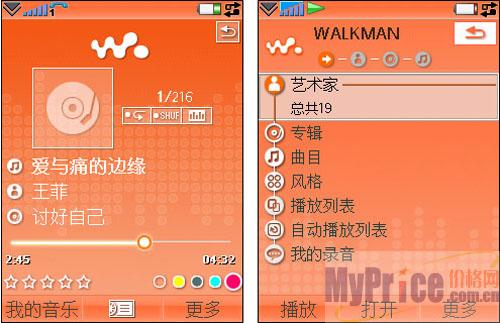 W958c采用了全新的Walkman 2.0版本音乐播放器,除了在界面上更胜一筹外,W958c还提供了更细致、专业的曲目分类检索功能,更炫酷的视觉特效,更丰富的EQ均衡器调节,以及书签、睡眠定时关闭等细节功能。全新的播放界面包括支持专辑封面显示以及专辑和曲目的评级(1~5星级)等等。详尽的曲目分类功能也绝非为了界面更为华丽。