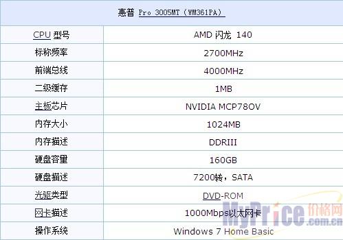 在配置上,采用了AMD闪龙140处理器(主频2.7GHz),拥有4000MHz前端总线、1MB二级缓存。和NVIDIA MCP78OV主板芯片组,集成显卡,标配1G DDR3内存、160GB高速硬盘,预装Windows 7 Home Basic操作系统。让您轻松应付商务办公要求。