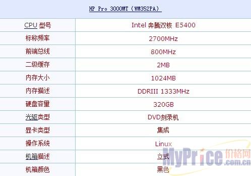 在配置上,惠普Pro 3000MT(WM351PA)电脑采用英特尔奔腾双核 E5400处理器(2.7GHz主频),标配1GB内存和320GB硬盘,Nvidia Geforce8500GT独立显卡,Linux系统。