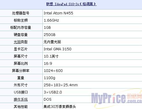 联想 IdeaPad S10-3c(格调黑)上网本是联想公司最近推出的最叫好的一款上网本,其搭载了目前最流行的英特尔Atom N455处理器,并装配250GB硬盘。1.1千克的重量,时尚的外形让其在刚上市时就获得不错的好评。现在,该上网本的报价为2499元,喜欢的朋友可以联系下面的经销商。