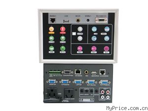 1、 前面板具有网路、MIC麦克风、USB、笔记型电脑VGA、电脑ψ3.5mm音频输入端口。 2、 1组电脑开关控制接口。 3、 2组I/O介面,可接门锁等。 4、 1组DC12V电源介面,可接电控锁。 5、 1组RS232电脑控制介面。 6、 1组RS232投影机控制。 7、 1组IR红外线投影机控制。 8、 1组网路(TCP/IP)控制介面。 9、 3×2 VGA矩阵切换器。(可连接台式电脑,手提,数字展台) 10、3×1 AV切换器。(可连接影碟机,AV展台,一路备用) 11、1组投影机电源插座。 12、1组电动银幕电源控制。 13、具有LED显示薄膜式切换选择按键。 14、内嵌式红外学习功能,无须配置专业学习器。 15、电源输入:AC 100-240V自动交换式电源。 16、开孔尺寸:188mm*111mm