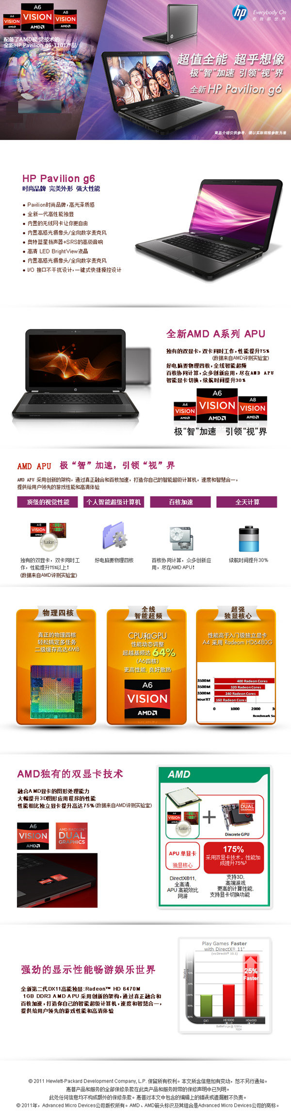 惠惠普G6 1303TX笔记本,采用了钛金灰为外观主调,表面运用了钢琴烤漆工艺,非常光滑;性能方面,该机还配备有一块AMD Mobility Radeon HD 7450M独立显卡,屏幕为LED背光15英寸,屏幕比例为16:9,屏幕分辨率可达到1366*768,其外形尺寸为374*245*36.3mm,含电池重量约为2.3kg,在同类笔记本中还是非常轻巧的。采用的是ATI Mobility Radeon HD 7450 独立显卡+AMD HD(集成于处理器),显存为1GB,内存方面标配2GBDRR3 1066MHz ,最大可扩充为8GB,搭配了INTEL I5-2450M处理器,标准主频2.5GHz,硬盘方面则为5400转SATA接口640GB,足已满足大多数用户的需求。