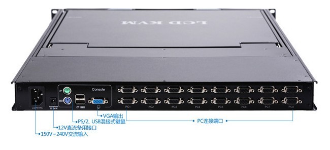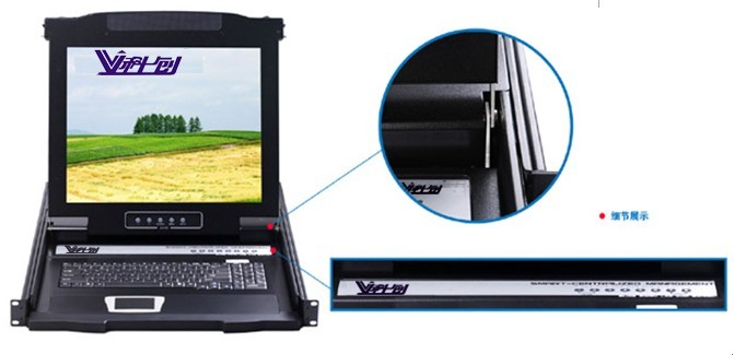 LCD KVM多电脑切换器,为一组控制设备,其允许从一组控制端(键盘、显示器、鼠标)安全控管高达8台电脑;其整合了LCD屏幕、键盘及触控板于抽拉式的机体内,并可安装于1U高度空间机架上。LCD屏幕及键盘/触控板模块可以抽拉出来,为了提高您机房内空间使用的效率,当不需要使用时,可以将其收回,置于机柜内,节省了键盘、鼠标、监视器所占用的空间。