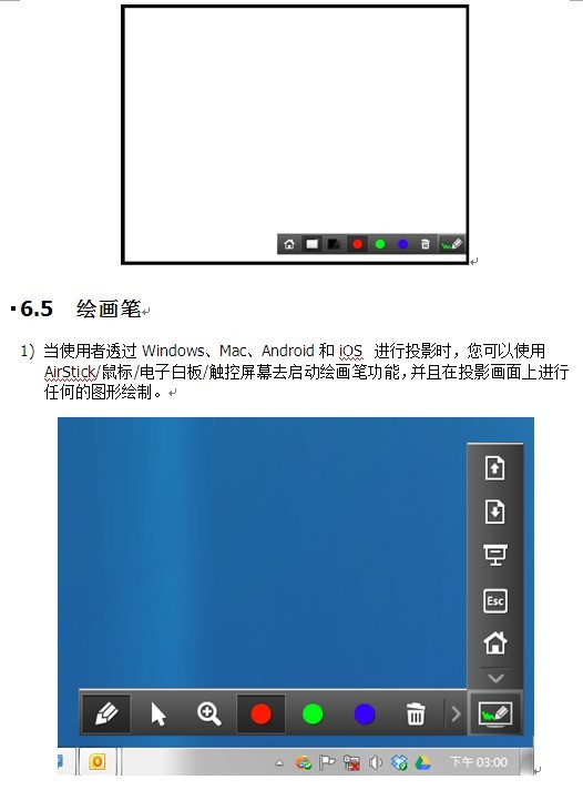 1) 点击“Whiteboard”按钮启动虚拟的白板功能,您可以在此画面上透过USB AirStick、鼠标、触控屏幕/电子白板进行任何的绘画。