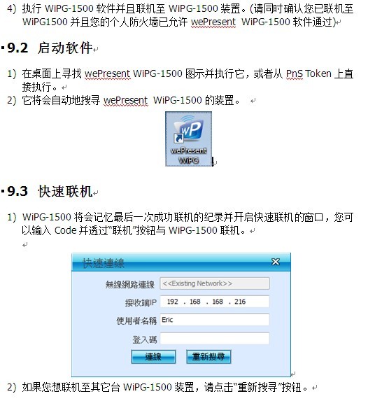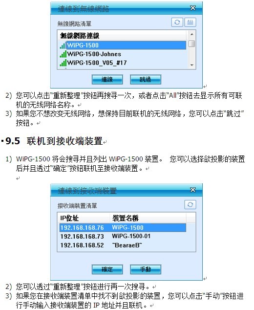 1) WiPG-1500将会搜寻可联机的无线网络并且也会列出WiPG-1500装置。 您可以选择其中一个无线网络并透过“联机”按钮与选择的无线网络装置联机。