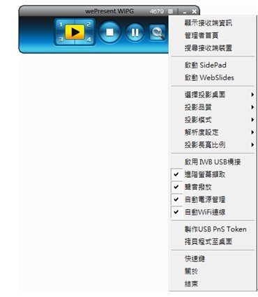 1) WiPG-1500可支持Win7/8标准HID兼容性触控装置。经由插入HID触控屏幕/电子白板装置,您可以在待机画面、WhiteBoard功能和投影中的PC/手持装置,透过触控屏幕/电子白板进行操作。